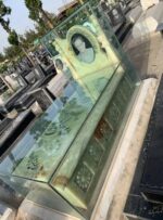 سنگ مزاری که مشاهده می فرمائید:از نوع سنگ قبر مرمر سبز می باشد ،باکس آن CNCوحجاری بسیارزیبای از طرح گل برجسته شده است ،کل مجموعه سنگ قبر در یک باکس محافظ شیشه سکوریت بسیار مقاوم قرار داده شده است که در مقابل گرد وخاک ،سرما وگرما ،برف وباران وطولانی تر شدن در نگهداری این کار بسیار شکیل که جزء رده سنگ قبر لاکچری می باشد قرار گیرد. این کار زیبا دارای کتیبه طرح آلاله ودوعدد گلدسته در اطراف کتیبه می باشد. انتخاب این طرح بسیار زیبا ولاکچری می تواند ،انتخاب  بهترین یادبود وآرامگاه بسیار باوقار ومتین برای عزیزان آسمانی باشد.