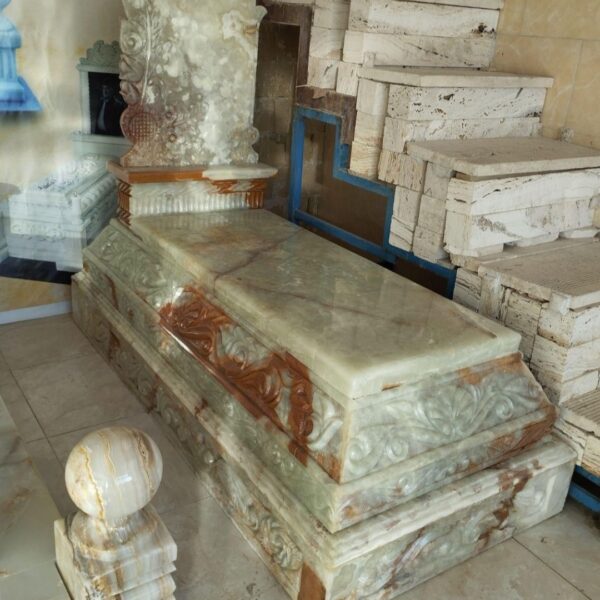 سنگ مزاری که مشاهده می فرمائید:از نوع سنگ قبر مرمر سبز می باشد ،باکس آن CNCوحجاری بسیارزیبای از طرح گل برجسته شده است ،کل مجموعه سنگ قبر در یک باکس محافظ شیشه سکوریت بسیار مقاوم قرار داده شده است که در مقابل گرد وخاک ،سرما وگرما ،برف وباران وطولانی تر شدن در نگهداری این کار بسیار شکیل که جزء رده سنگ قبر لاکچری می باشد قرار گیرد. این کار زیبا دارای کتیبه طرح آلاله ودوعدد گلدسته در اطراف کتیبه می باشد. انتخاب این طرح بسیار زیبا ولاکچری می تواند ،انتخاب  بهترین یادبود وآرامگاه بسیار باوقار ومتین برای عزیزان آسمانی باشد.
